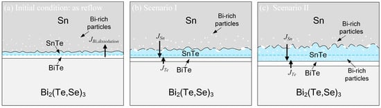 Schematic illustration of the solid-state Sn/Bi2(Te,Se)3 reactions: (a) the initial condition, (b) Scenario I, and (c) Scenario II.