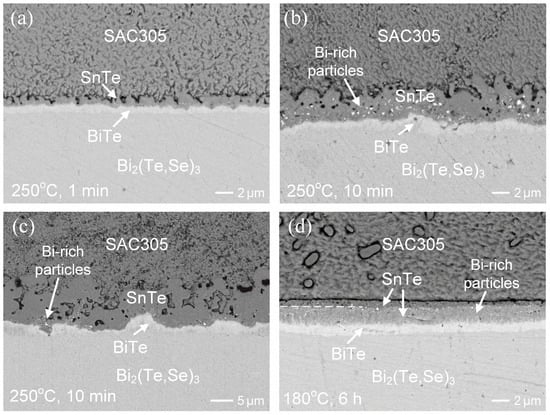 BEI micrographs of the SAC305/Bi2(Te,Se)3 reactions, (a–c) at 250 °C for 1 min, 10 min, and 30 min, respectively; (d) at 180 °C for 6 h.