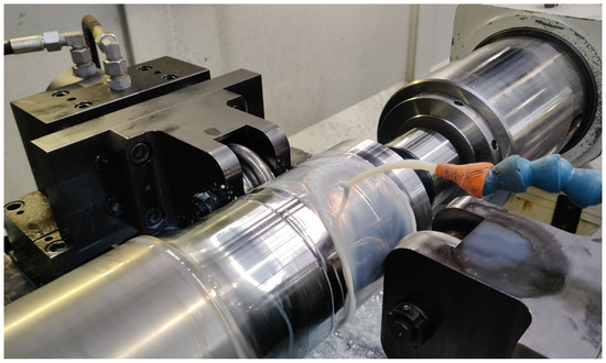 Experiments 1 and 2 are carried out on two cylindrical sections of a railway axle, which has been used in previous studies [14]. As mentioned above, all the deep rolling parameters remain identical, except for the feed rate. The deep rolling tool is mounted on a lathe on the tool carriage, and the railway axle parts are clamped. The test set-up is shown in Figure 1. A twin tool with opposing discs is used for deep rolling. The dimensions of the discs are given in Table 1. The deep rolling force FDR of 20 kN is generated hydraulically. The force is increased with a ramp at the beginning of the machining process, then held constant for 96 mm in the test area and reduced again at the end. A rotational speed of 180 rpm is used. During machining, the process is cooled and lubricated with coolant.