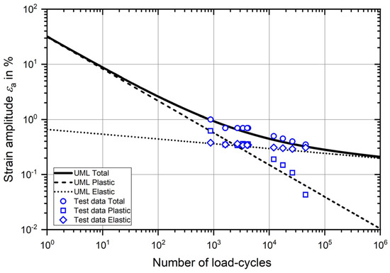 Figure 2 shows the strain-life curve according to the UML using the parameters specified above in Table 2. The total strain-life curve and also its elastic and plastic components are shown. The validity of the UML for the material analysed is verified by the test results. In addition to the tensile tests, numerous cyclic tests were carried out on specimens taken from the analysed railway axle, some of which are presented in [14]. The results which include different applied strain amplitudes and a constant load strain ratio of Rε = −1 are also plotted in the same diagram. Again, the total strain amplitude and the elastic and plastic components are plotted. The estimated strain-life curve shows good agreement with the test results.