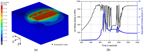 Simplified railway axle section of the simulation model during simulation procedure of Experiment 2 with marked evaluation node (a) and von Mises stress and equivalent of total strain over simulation time evaluated there (b).