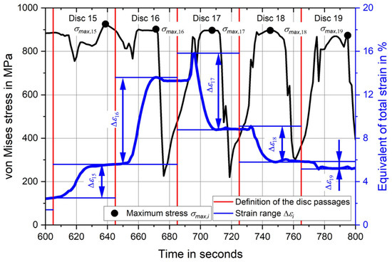 From the stress and strain over time curves shown in Figure 3b, the required strain changes and maximum stresses for each disc are derived. This is now explained using Figure 4, on which a section of Figure 3b is shown. At the beginning, the time sequence for each disc is subdivided. This is shown by the red lines. In between there are the strain and stress changes for each passing disc. The time intervals with the largest strain changes, discs 15 to 19, are shown.