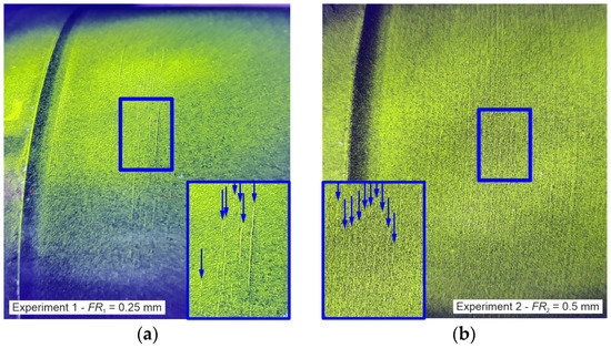 This section presents the results of the experiments described in Section 2.1. Two experiments are carried out on two cylindrical parts of the railway axle. The deep rolling overruns are repeated until damage is detected by magnetic particle inspection. In Experiment 1, with a feed rate FR1 of 0.25 mm, the first damage is detected after j = 23 deep rolling overruns and in Experiment 2, with a feed rate FR2 of 0.5 mm, after j = 48 deep rolling overruns.