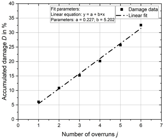 In Figure 6, the total damage D is plotted over the number of deep rolling overruns j for Experiment 1. A linear increase in damage is found for both Experiments, and the total damage is, therefore, linearly approximated. The parameters of the equation are given for Experiment 1 in the diagram. A similar trend is observed for Experiment 2. The parameters for the linear approximation of Experiment 2 are a = 1.261 and b = 2.466.