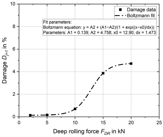 Firstly, the influence of the deep rolling force on the damage introduced is investigated for one overrun (j = 1). The deep rolling forces 20 kN, 15 kN, 10 kN, 5 kN and 2 kN are considered and analysed exclusively. The feed rate is kept constant at 0.5 mm. Five separate simulation models are set up and simulated with the appropriate forces. The required strain and stress are then evaluated, and the damage for a deep rolling overrun with the corresponding deep rolling force is determined using the evaluation method presented. The result of the evaluation is shown in Figure 7. It displays the damage with the deep rolling force. The points plotted are the evaluated results. A suitable equation is found to describe the relationship between damage and deep rolling force. The relationship, equation and parameters are shown in the diagram.