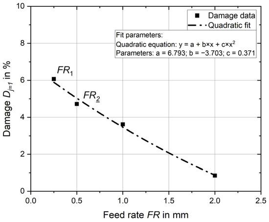 Exactly this behaviour is shown in Figure 8, where the results of the evaluation are again shown as points and the relationship between damage and feed rate is described by an equation. A quadratic equation is suitable for describing the behaviour here, and the parameters are listed in the figure.
