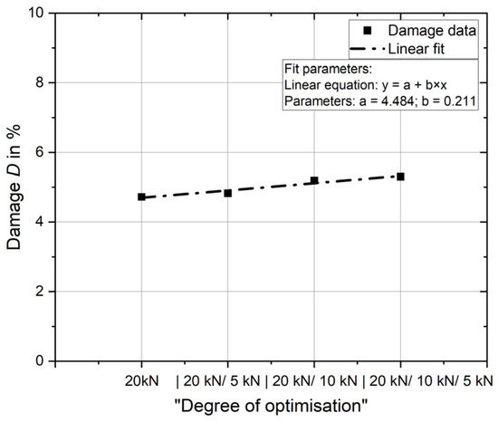 The results are shown in Figure 9. The damage is plotted against the increasing “degree of optimisation”. The relationship can be described in simplified terms by using a linear equation. The parameters are shown again in the diagram.