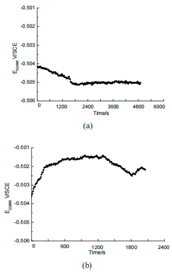 The prepared working electrode was soaked in a saturated calcium hydroxide solution containing the rust inhibitor and sodium chloride for about 30 min, then the open-circuit potential test was carried out, and the open-circuit potential was stable when the potential change value was less than 2 mV within 5 min (300 s).