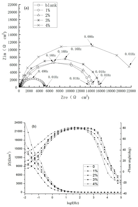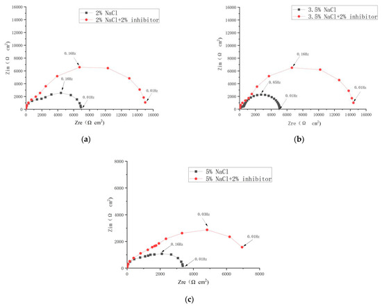 The effects of the inhibitor concentration on the impedance behavior of steels in 3.5% NaCl solution are shown in Figure 6. The information on |Z| at 10−2 Hz are provided in Table 2. It can be seen from the Nyquist plots in Figure 6 that the impedance spectra diameter in the inhibitor solution was significantly higher than in the absence of the inhibitor. In addition, it increased with higher inhibitor concentrations. The difference in the impedance arc at inhibitor concentrations of 1 and 2% was relatively small. However, an obvious increase in the electrochemical resistance was observed for specimens with the inhibitor of 3%. This indicated that the corrosion reaction of the carbon steel surface was effectively decreased [29]. The results are consistent with Zhao’s [30] and Xu’s [31] findings.