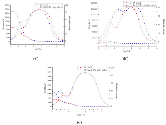 Nyquist plots (a–c) and Bode plots (a’–c’) of the steel in solutions with different NaCl concentrations.