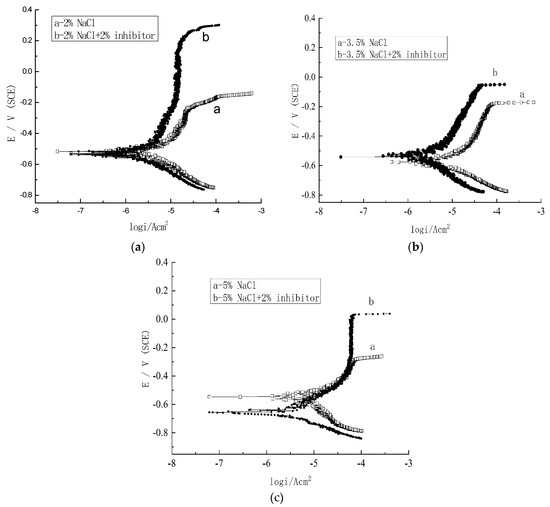 The Nyquist plots and Bode plots of the steel electrodes immersed in the simulated concrete pore solutions with different NaCl concentrations are shown in Figure 8, and the polarization curves are shown in Figure 9. In addition, |Z| at 10−2 Hz is shown in Table 4. Figure 8 shows that with the increase in NaCl concentration, the steel corrosion became more significant. After the addition of 2% inhibitor, the impedance spectra diameter of the steel electrode turned to a higher value than that of the blank groups with different concentrations of NaCl. This suggests an excellent corrosion resistance of the inhibitor for steels at different NaCl concentrations. Based on the fitted data, the inhibition efficiency according to the Equation (3) was calculated to be 65.62, 80.06, and 66.30% at NaCl concentrations of 2.0, 3.5, and 5.0%, respectively.