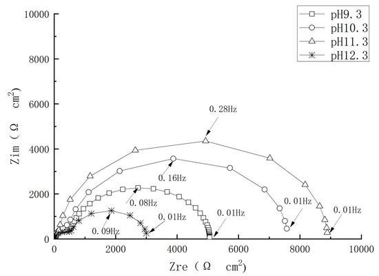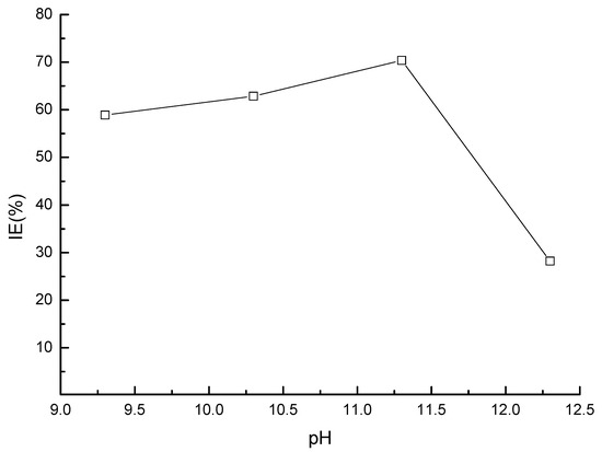 The strong alkali environment is beneficial to maintaining the stability of a passivation film. Related studies have shown that a steel bar can be completely passivated in a strong alkaline environment when the pH value is greater than 11.5. When the pH value near the steel bar reaches 9.88–11.5, even if there is no chloride ion near the steel bar, the film will also dissolve due to instability. It can be seen from Figure 10 that the impedance spectra diameter of the steel electrode increased with the pH value, meaning that the alkaline environment is favorable for enhanced corrosion resistance of the steel. It was also found that both the steel dissolution and the oxygen reduction processes were restricted in the presence of the inhibitor at all pH conditions. In addition, as shown in Figure 11, the inhibition efficiency first increased and decreased again afterwards with the increase in the pH value. The highest corrosion resistance value was observed at a pH value of 11.3, which could be attributed to the formation of complete passive film on the steel bar surface under this pH value condition.