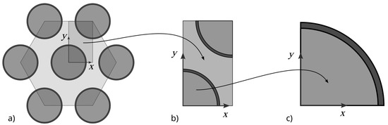 Determining the influence of the interphase on the effective thermal conductivity coefficient of composite materials filled with long fibers arranged in parallel within the matrix was carried out for a hexagonal fiber arrangement (Figure 1a). Such an arrangement of fibers provides the highest potential fiber volume fraction of the composite, reaching a value of (πr2/2)/(30.5r2) ≅ 0.907 (the maximum ratio of the area occupied by a fiber with radius r to the total area of the RVE). The analysis of such a structure can be carried out by examining the RVE (representative volume element). In the case of a hexagonal structure, this element can be represented by a rectangle containing fiber quarters, as shown in Figure 1b. The fiber elements in this structure are surrounded by an interphase of assumed constant thickness (Figure 1c).