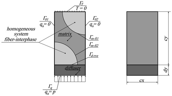 In the schema shown in Figure 3, an additional heat dispersing material is visible (diffuser), which aims to equalize the temperature at the boundary Γd-rve of the RVE, simplifying the calculation of the effective thermal conductivity coefficient, according to the methodology presented in [16]. The shown specimen is thermally insulated along the boundaries Γ01 and Γ02, subjected to a heat flux with intensity p on the boundary Γq, and subjected to a prescribed temperature of 0 °C at the boundary ΓT. Consequently, the boundary conditions can be written as follows: