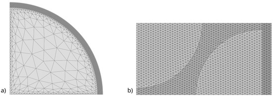 The discretization of the fiber, interphase, and composite matrix areas was carried out in a way that suited the specifics of the problem being solved. The discretization was performed using three-node triangular elements. The discretization process was carried out automatically, depending on the fiber cross-sectional diameter and the interphase thickness. The automation of this process allowed for the automation of studies on the selected range of interphase thickness variations and fiber volume fractions in the composite matrix, eliminating the need for tedious manual adjustment of parameters for the tested specimens.