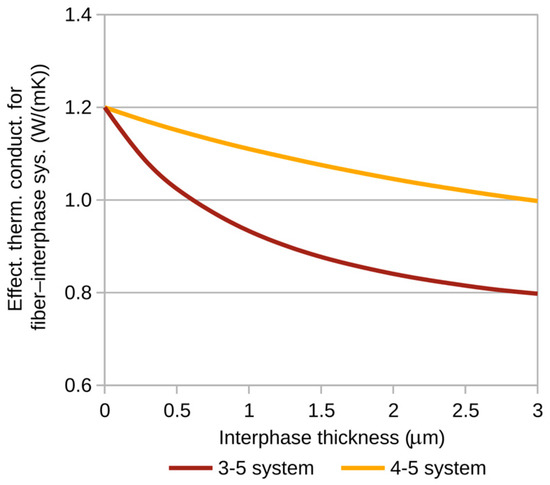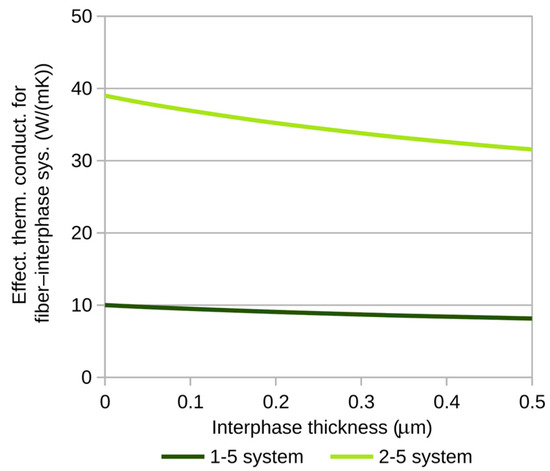 Figure 5 and Figure 6 show the variations in the effective thermal conductivity coefficient of the fiber–interphase system for the previously proposed fiber–matrix combinations. The calculations were performed for a heat flux of p = 10−3 W/m (Figure 4).