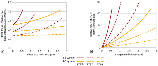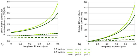 To better observe the interphase’s influence on the composite’s thermal conductivity coefficient, graphs of the relative differences of the investigated coefficients (relative to the coefficients of composites with zero interphase) were created. The corresponding differences are shown in Figure 7b and Figure 8b. The calculations were performed for variable fiber volume fractions of the composite. In each of the plots (Figure 7 and Figure 8), the corresponding quantities are illustrated as a function of interphase thickness for three selected fiber volume fractions of the composite: ρ = 0.2, 0.4, and 0.6.