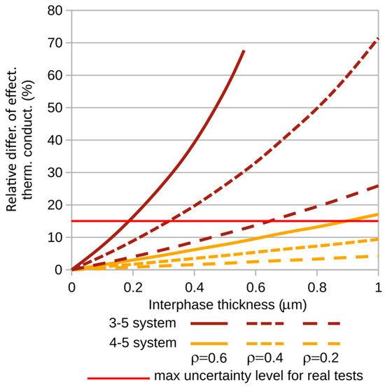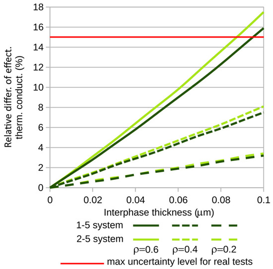 To further illustrate the analyzed problem, Figure 9 and Figure 10 show the relative differences in thermal conductivity coefficients for small, practically observed ranges of interphase thickness variations. For carbon fibers, the maximum interphase thickness considered was 0.1 µm, while for glass fibers it was 1 [µm]. The red line indicates the maximum uncertainty level in thermal conductivity measurements typically encountered in real-world experiments [27]. This level is shown here to highlight the range of variations in thermal conductivity which are too large—too significant to neglect the influence of the interphase on the studied phenomenon.