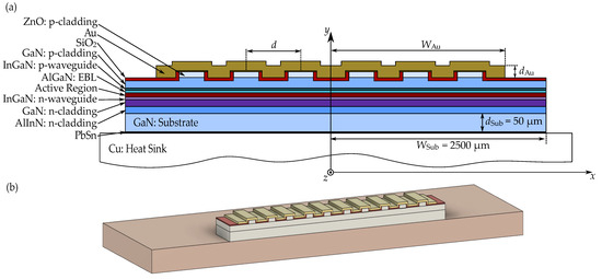 N. The active region consists of three 2.7 nm N quantum wells, surrounded by four 10 nm GaN barriers. Directly above the active region is a p-N electron blocking layer (EBL) and a p-type waveguide made of N. The p-type cladding layer, consisting of a p-GaN layer and a ZnO layer, is located above the waveguide. The ZnO layer has already been used in lasers as an optical confinement layer [40,41,42]. A ridge waveguide with a width of 2 µm was fabricated in these layers. A gold contact is situated on top of the emitter, insulated from the structure by a silicon dioxide layer except at a small area atop the ridge waveguide. A schematic and a three-dimensional visualization of the edge-emitting laser array are shown in Figure 1, and detailed design data of the analyzed structure is provided in Table 1. In Figure 1a, the individual layers of the array and the most important dimensions are labeled. The width of the top gold contact is denoted as and its thickness as .