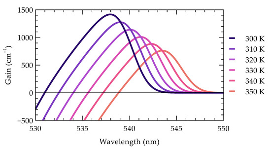 Nitride materials, such as GaN, InGaN, InAlN, and AlN, exhibit significant shifts in emission wavelength as a function of temperature, which impact the stability and performance of optoelectronic devices like LEDs and edge-emitting lasers. The values for these materials typically range from 0.1 nm/K to 0.4 nm/K, depending on the device structure and operating conditions [65,66,67,68,69]. For the structure under consideration, this is illustrated in Figure 3, which shows the calculated material gain in the laser’s active region as a function of wavelength for various temperatures. As the temperature increases, a reduction in gain is observed, accompanied by a red shift in the gain peak relative to the target emission wavelength. Consequently, temperature affects other parameters, such as threshold current and efficiency, emphasizing the importance of effective thermal management in these devices, especially under extreme conditions, where wavelength shifts can reach up to 0.5 nm/K.