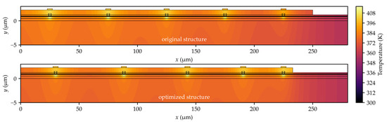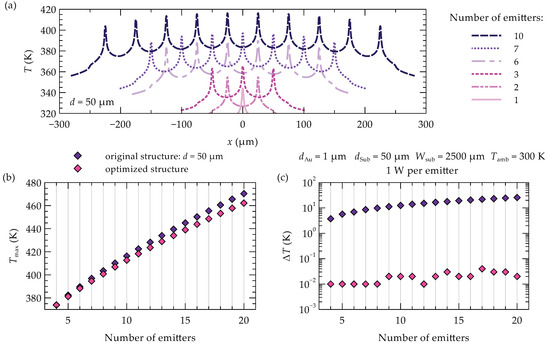 Proper selection of the gold contact layer width allows not only for temperature equalization across the outermost emitters but also for a reduction in the maximum temperature across the entire array (see Figure 4b and Figure 5). This effect is particularly pronounced in arrays with a larger number of emitters. For instance, in a 20-emitter array, the maximum temperature is reduced by 2% compared to the unoptimized structure, while in a smaller array (e.g., 10 emitters), the reduction is approximately 1%.