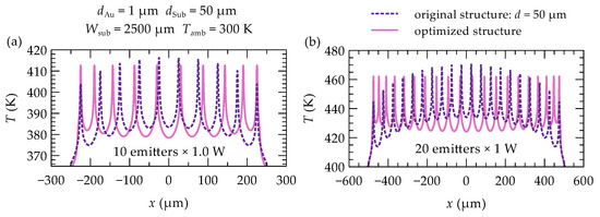 The thermal crosstalk phenomenon, although generally detrimental to heat dissipation, can be utilized to equalize the maximum temperatures across individual emitters in a laser array. The proposed solution involves unevenly spacing the emitters within the array. This approach imposes a constraint: the positions of the outermost emitters remain fixed to ensure that the overall device size is identical to that of an array with evenly spaced emitters. Furthermore, selecting an appropriate width () for the gold layer on top of the array (see Figure 1a) is crucial. This layer serves as the p-side electrical contact and acts as a heat spreader, facilitating lateral heat distribution within the laser bar. The developed optimization method enables the determination of emitter spacing and gold contact width that result in nearly identical temperatures in the active regions of the array emitters (see Figure 4c and Figure 5). In optimized multi-emitter arrays, these temperature differences do not exceed 0.02 K, and in larger arrays, they are no more than 0.05 K. The effect of these modifications on the temperature profiles in the emitters’ active regions is shown in Figure 5, which compares the temperature profiles before (dashed line) and after (solid line) optimization for two arrays: (a) a 10-emitter array and (b) a 20-emitter array. Additionally, Figure 6 illustrates the temperature distribution in a 10-emitter laser bar before and after optimization.