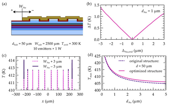 Impact of manufacturing precision of the gold width: (a) schematic of the examined precision, (b) maximum temperature difference between the emitters of the optimized 10-element array as a function of the dimensional deviation from the recommended gold width, (c) temperature profile section of the optimized array with gold layers 3 µm longer and shorter, and (d) impact of the gold contact thickness on the maximum temperature in the array.