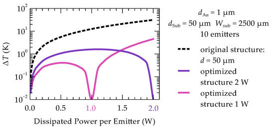 The presented optimization results were obtained under the assumption that each emitter dissipates 1 W of power. However, varying this value does not lead to significant changes. In other words, the optimized structure shows robustness for a large range of powering. The impact of the dissipated heat in individual emitters of the array on the maximum temperature differences () between the emitters is shown in Figure 8. Reducing the dissipated power in the laser leads to slight temperature changes in the emitters, but the temperature unevenness does not exceed 0.4 K. On the other hand, at higher powers, a faster increase in temperature unevenness between the emitters is observed. Increasing the power from 1.0 W to 1.5 W results in a maximum temperature difference of 1.5 K (purple line in Figure 8). Therefore, it is most appropriate to perform optimization for the maximum assumed power at which the emitters will operate. An example of performing optimization for higher power and applying it to lower powers is shown in Figure 8 (pink line). With this approach, the maximum temperature difference between emitters increases, but this increase remains relatively small and does not exceed 1.6 K for all lower power values compared to the power for which the optimization was performed.