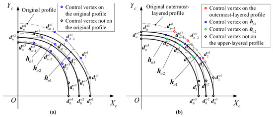 Setting of control vertices according to the convex hull property [51]. (a) Control vertices on original profile; (b) Control vertices on upper-layered profile.