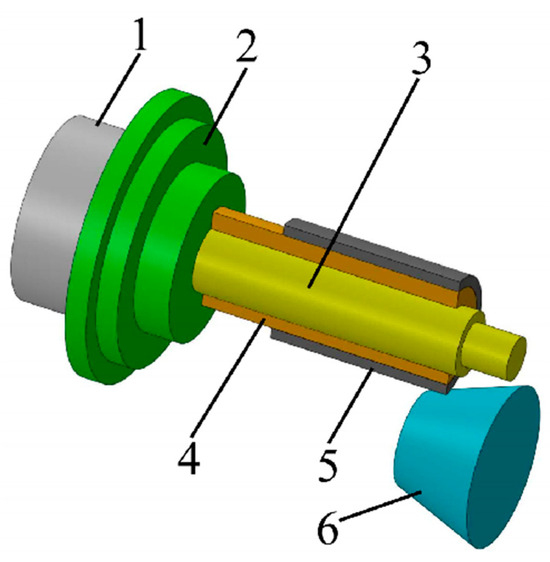 Spinning process (1, spindle; 2, flange; 3, mandrel; 4, inner tube; 5, outer tube; 6, spinning wheel).