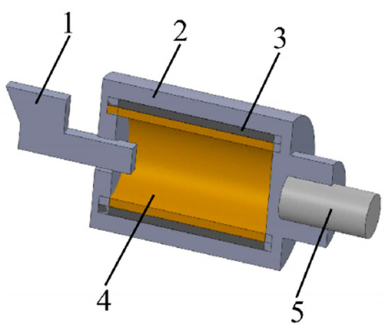 Centrifugal casting process (1, pouring gate; 2, mold; 3, outer tube; 4, inner tube; 5, pindle).
