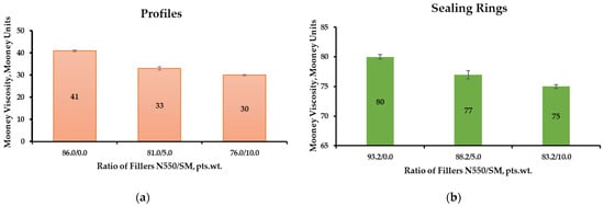In formulations based on a combination of the rubbers SKEPT-50 + SBR-30 ARKM-15, intended for rubber profiles, it was found that replacing 5.0 and 10.0 pts. wt. of carbon black grade N550 with SM resulted in a 19.5% and 26.8% decrease in the Mooney viscosity of the rubber compounds (Figure 3a). In the formulations based on the special-purpose rubber NBR-12AN, intended for sealing rings, this indicator decreased slightly, up to 6.3%, when carbon black was replaced (Figure 3b). This behavior may be attributed to the nature of the mineral, specifically the physical–chemical properties of its surface, which influence its interaction with different rubber matrices.