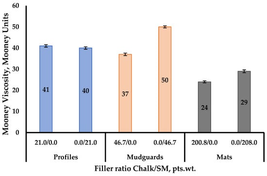 In the case of complete replacement of industrial chalk with SM, it was found that the Mooney viscosity of the rubber compounds for profiles remained practically unchanged (the change was 1 Mooney unit). At the same time, the use of SM in the formulations for rubber mudguards and mats increased this parameter by 35.1% and 20.8%, respectively, compared to industrial rubber compounds (Figure 4).
