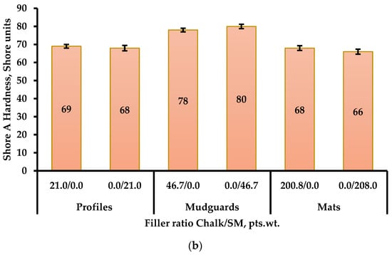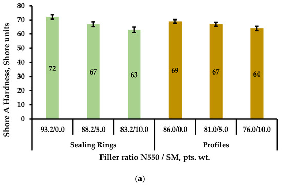 It was determined that replacing the semi-reinforcing carbon black grade N550 with SM at dosages of 5.0 and 10.0 pts. wt. reduced the hardness of rubbers for sealing rings by 5 and 9 Shore A units, respectively (Figure 5a). In contrast, a different trend was observed with the complete replacement of chalk with SM (Figure 5b). Specifically, the full replacement of industrial chalk with the studied mineral in rubbers intended for the production of profiles, mudguards, and mats had virtually no effect on the hardness of the vulcanizates (the change was 3 Shore A units, which falls within the measurement error range).