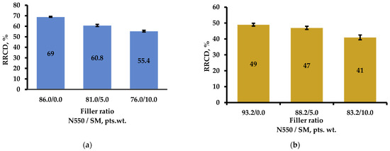 Changes in RRCD of elastomer compositions of various purposes containing SM: (a) partial replacement of N550 in formulations for profiles; (b) full replacement of chalk in formulations for sealing products.