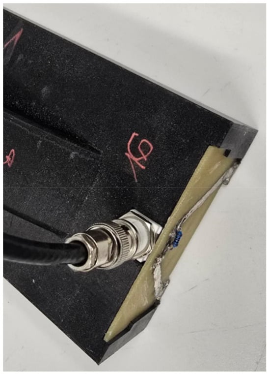 The 3D sensor housing measures 200 mm in length. The spacing between the measurement rods, made of brass flat bars, is 42 mm. The waveguides, also constructed from brass, have dimensions of 10 mm × 2 mm × 200 mm. They are press-fitted into the 3D-printed housing. The flat bar is directly embedded in the housing, ensuring that the rods are solely in contact with the material under investigation. The probe communicates with the TDR meter via a BNC connector, which is soldered to a printed circuit board (PCB). The PCB connects the measurement rods to the connector. A coaxial cable is used to connect the probe to the TDR meter (Figure 3).