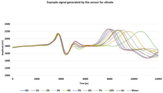 The signal response of the 3D-printed sensor during TDR measurements of silicate samples at varying moisture levels.