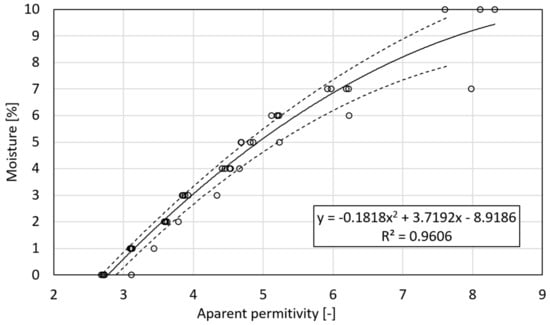 A model was prepared for the measurement data obtained. The dependence of moisture and apparent permittivity for the tested silicate along with the designated confidence bands is shown in Figure 7.