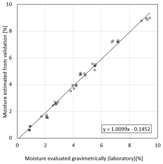 Linear dependence between the moisture values achieved in laboratory sample preparation and evaluation using the sensor prototype is presented in Figure 8. The results show the good fit between the data obtained and model derived. The slope coefficient of this formula equals 1.0099 and is close to 1 and the y-intercept equals 0.1452 and is close to zero.