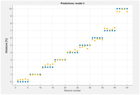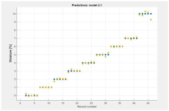 Raw data were collected in the form of a sequence of voltage values as a function of time. The reflections observed are a result of wire discontinuities caused by the sensor’s structure, including the resistor (input peak) and the sensor’s termination (output peak). Based on this, permittivity is determined for calibration using traditional methods, which involves constructing deterministic models. In the case of machine learning approaches, the raw signal, represented as a series of voltage values, is directly analyzed. To facilitate this, a data matrix was constructed, where individual vectors corresponded to voltage values, and the target data consisted of the humidity levels determined through laboratory measurements. The measurement results obtained were imported into MATLAB for analysis using machine learning techniques. The Regression Learner tool was employed, which offers a wide range of algorithms, including linear regression, decision trees, random forests, gradient boosting models, and SVM regression. This tool enables users to compare different models to identify the best fit for their data and facilitates training using various mathematical models. To evaluate the root-mean-square error (RMSE), the data were implemented, and two models were selected: Gaussian Process Regression (GPR) and Support Vector Machine (SVM). The GPR model is an advanced statistical approach used for data modeling and forecasting. It is based on the concept of stochastic processes, assuming that any set of data points can be described by a multivariate Gaussian distribution. This methodology not only provides predicted values, but also gives an estimation of their associated uncertainties. The SVM model, or the Support Vector Machine model, is a widely used machine learning method, particularly for classification and regression tasks. It excels in handling complex datasets and identifying patterns within them. GPR and SVM methods were used to analyze the results. This choice was made due to the fact that the processed raw TDR signal presented a series of voltage changes over time, with only one value recorded for each measurement. The SVM method, although it worked better in the case of multidimensional data, did not fully use its capabilities for the analyzed signal. However, Gaussian Process Regression (GPR) is characterized by greater flexibility and universality when working with one-dimensional data, which allows for the maximum accuracy of readings [54,55]. The results obtained using a surface sensor with a 3D-printed housing were analyzed through machine learning. This was initially performed using Gaussian Process Regression (GPR) and subsequently conducted with Support Vector Machine (SVM). The machine learning outcomes for data acquired via the TDR meter are summarized in Table 6.