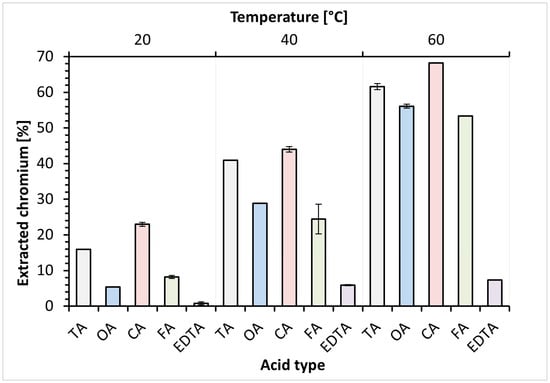Many studies have examined how varying parameters affect Cr removal efficiency, noting that proper selection can enhance extraction by providing more reactive sites for Cr chelation [,,]. Based on previously conducted tests, four acids were chosen as potential chelating agents for effective Cr extraction. The second phase of the research focused on evaluating the impact of temperature and acid concentration on extraction efficiency, addressing discrepancies regarding whether the substitution mechanism is driven by the acid residue molecule or its concentration [,].
