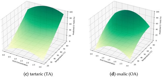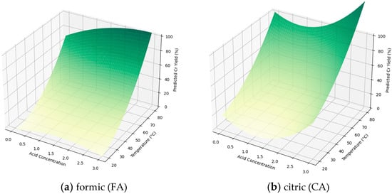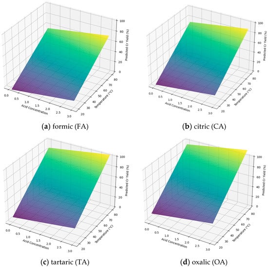 Figure 2 and Figure 3 illustrate the impact of temperature and acid concentration, showing predictions from both quadratic (yellow-green) and linear models (blue-green) for Cr yield across the experimental parameters. Tables S2–S5 and S6–S9 in the Supplementary Materials summarize coefficients, standard errors, test statistics, and estimates for the models. Tables S10 and S11 present results from fitting both models to the data for all investigated acids.