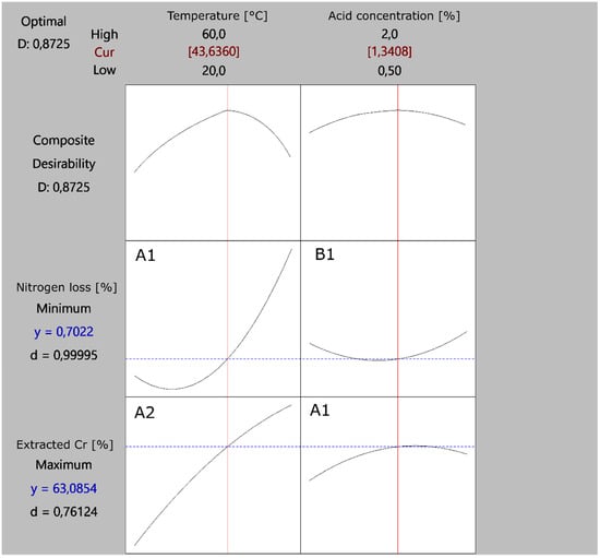 Response optimization plot showing conditions, where “Extracted Cr [%]” is maximized and “Nitrogen loss [%]” is minimized.