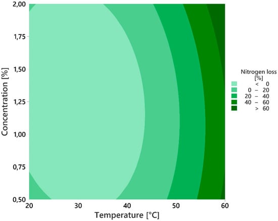 It was observed that, to completely prevent the hydrolysis of collagen proteins, the process should be conducted within a temperature range of 20 to 40 °C, as illustrated in Figure 5. Additionally, it is evident that an increase in temperature has a more pronounced negative impact on the Ntot loss from CTLS compared to an increase in OA concentration. This leads to reduced reagent consumption, resulting in environmental benefits.