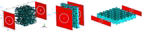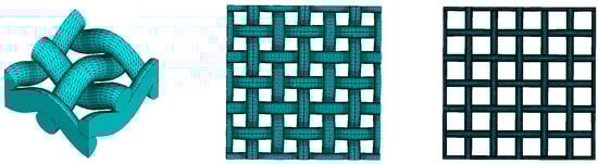 Woven fabric models were simulated by using models conformed of three-unit cells (as shown in Figure 2, left), with both warp and weft yarns sharing the same . Porosity (or ) was adjusted by modifying the spacing between successive warp and weft yarns while maintaining the same (see Figure 2, center and right).