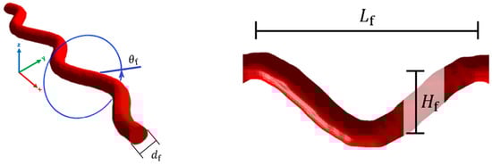 A sinusoidal wave-curved fiber is depicted, indicating (left) the fiber’s diameter and the angle of the curvature direction, as well as (right) the height and length of one of its curvature segments.