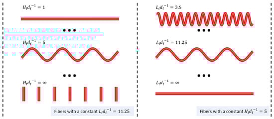 Numerical electromagnetic wave propagation calculations were employed to determine for various models of specifically oriented sinusoidal wave-curved fibers. This method seeks to model the parameter as a function of the fibers’ geometrical parameters, denoted as . Detailed numerical analyses were performed to delineate the fibrous medium’s microstructure, employing the parameters (components of ) used in the topological mixing relation (Equation (10)). The wave-curved fiber models were created in GeoDict with a fiber diameter of and ensuring no fiber overlap. The selected diameter size falls within the micrometer range, where the microwave wavelength is significantly larger, thereby satisfying the conditions for the effective medium approximation. The investigation explored the wave-curved fibers through the next geometrical parameters, as follows: