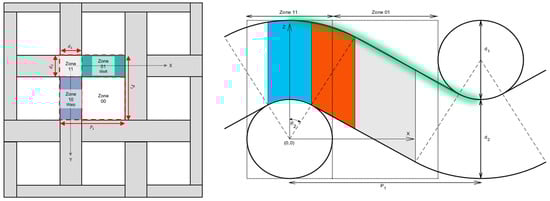 Notably, the model as proposed by Bal and Kothari []) is only valid under specific conditions, as follows: and . Thus, it does not apply to all possible weave angles of the yarns in a Peirce’s configuration. Therefore, the model has been revised to refine its applicability to those conditions that preserve a Peirce’s configuration. Following the methodology of Bal and Kothari, we categorize and into three distinct regions, as highlighted in Figure 9 (right) in blue (B), orange (O), and gray (G). Particular attention was given to the gray region, from which and (for and , respectively) have been modified as