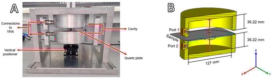 The cavity perturbation method was chosen to assess the reliability of the estimates of an alumina fabric from mixing relations and experimental data. The setup used for experiments is based on a split cylinder resonator that is designed to excite the TE111 mode within the 2.45 GHz band. The TE111 mode has a linear polarized electric field in the equatorial plane (orthogonal to the z-axis) of the cavity, which allows for investigating the anisotropic permittivity of planar dielectric materials. Figure 10A shows the setup, and Figure 10B shows its dimensions. The setup includes a quartz plate supporter to hold samples and a micrometer vertical positioner, which allows for precise adjustment of the split distance. The resonator is characterized by a high Q-factor of around 10,417 when closed and 9984 at a split distance of 1 mm. Measurements of the scattering parameters and frequency were performed while rotating the fabric around the equatorial plane.