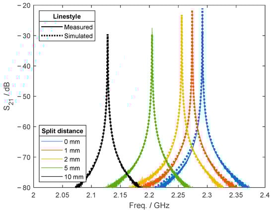 The measured scattering parameters were compared to those obtained from simulations of the split cylindrical model using CST Studio and are depicted in Figure 10B. Calculations were performed by defining the tensor of the fabric from the mixing relation based on interconnected straight fibers. In addition, was adjusted through tensor rotation, mirroring the experimental rotation of the fabric. Numerical calculations were conducted on the split resonator in the absence of a sample to validate the model’s alignment with the experimental setup. Figure 11 shows the parameter of the measured and simulated resonator at split distances of 0 (closed), 1, 2, 5, and 10 mm, demonstrating a good agreement of the resonance frequencies .